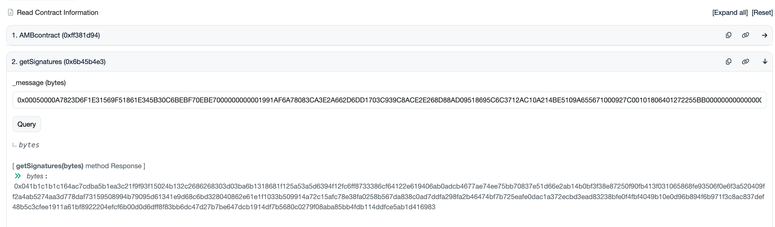 executeSignatures(bytes message, bytes signatures)on Foreign AMB. To fetch the calldata forexecuteSignaturesfunction, please follow the guideline below. - Foreign AMB contract decodes the message and calls
