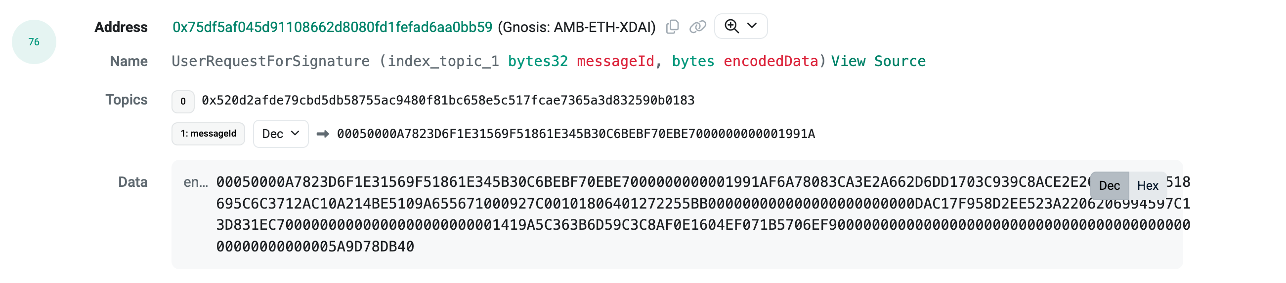 - Find the originating transaction on Gnosis Chain that interact with the Home AMB, and look for