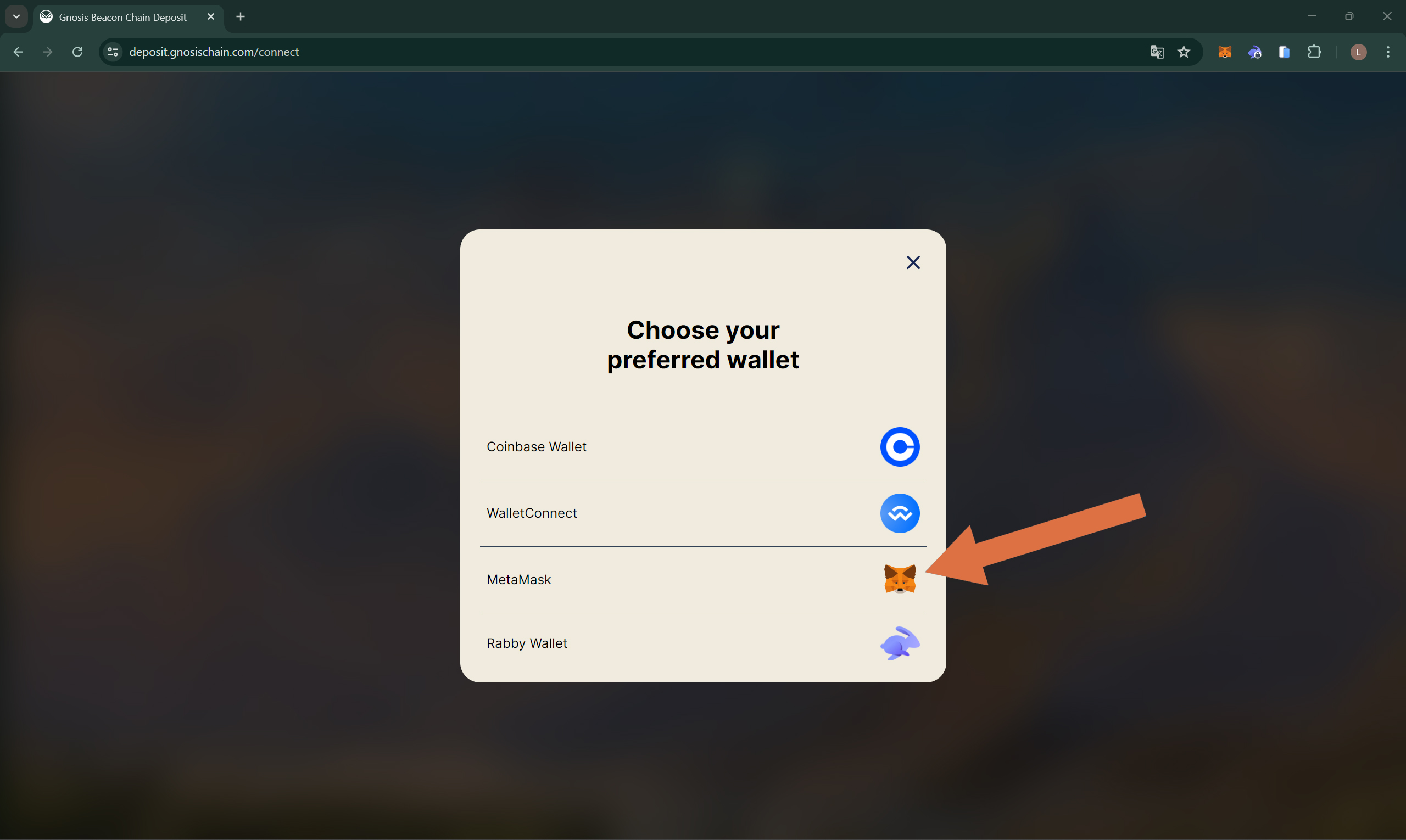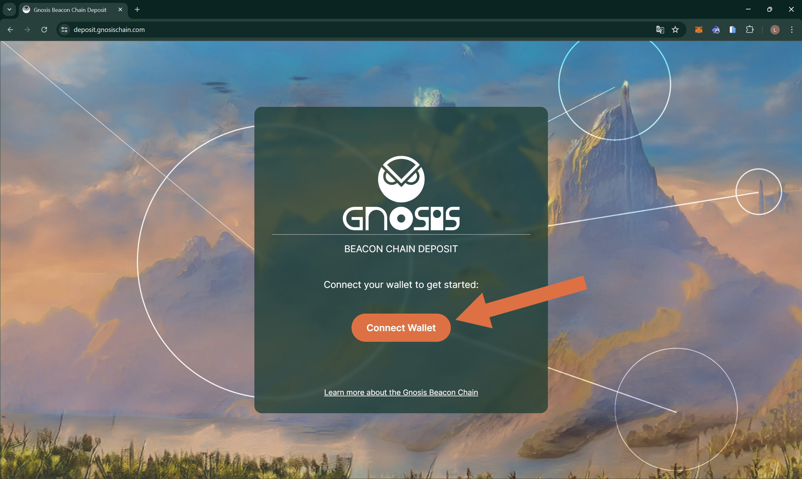 - Go to https://deposit.gnosischain.com/ and connect your web3 wallet on the Gnosis Chain to the application.