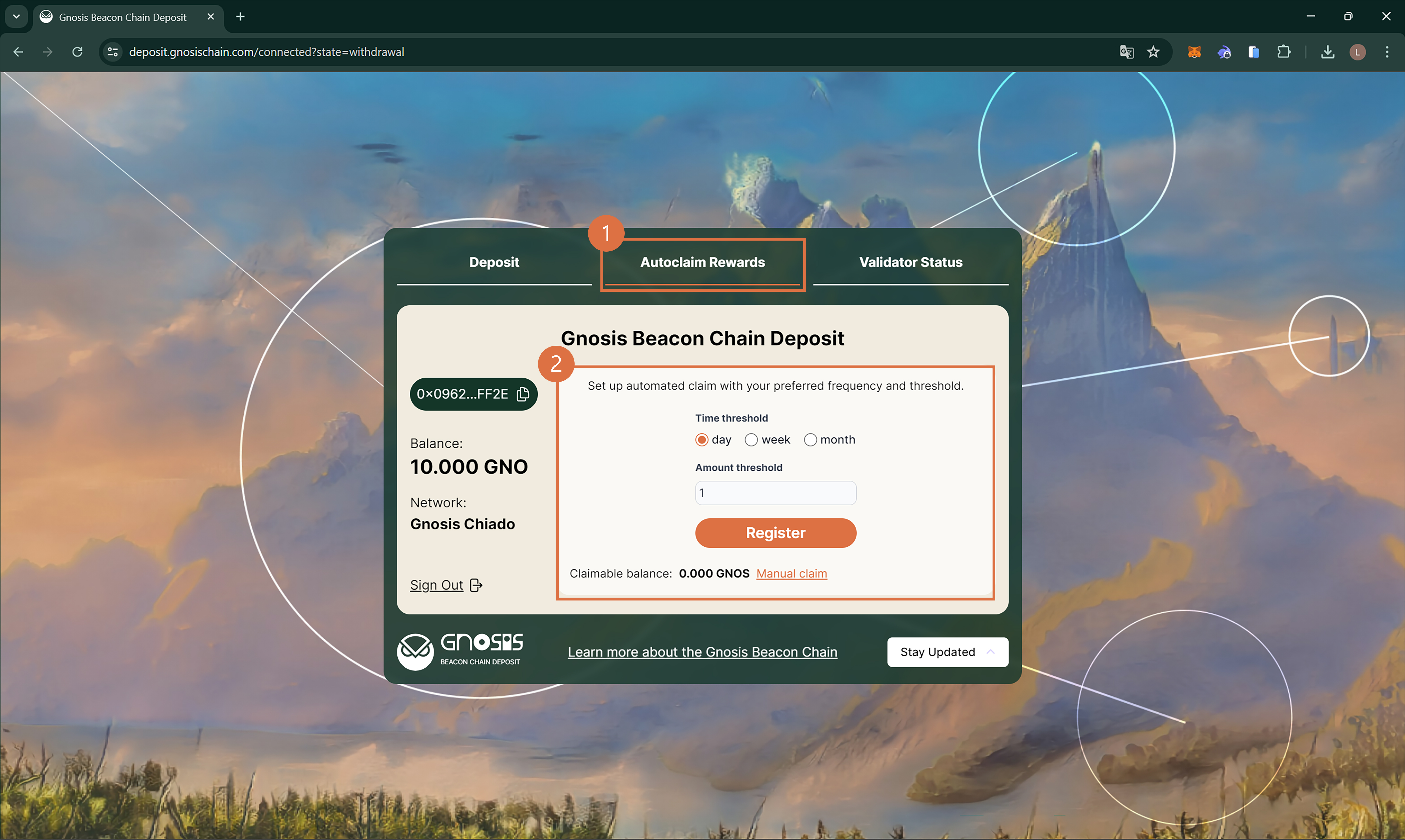 - Select the Autoclaim Rewards tab. Set the frequency and minimum threshold for automatic token claims based on your preference. After configuring, click Register to continue.