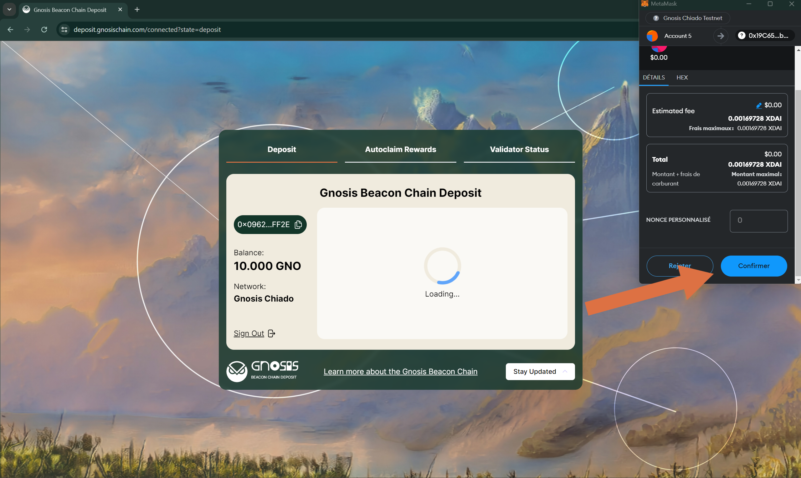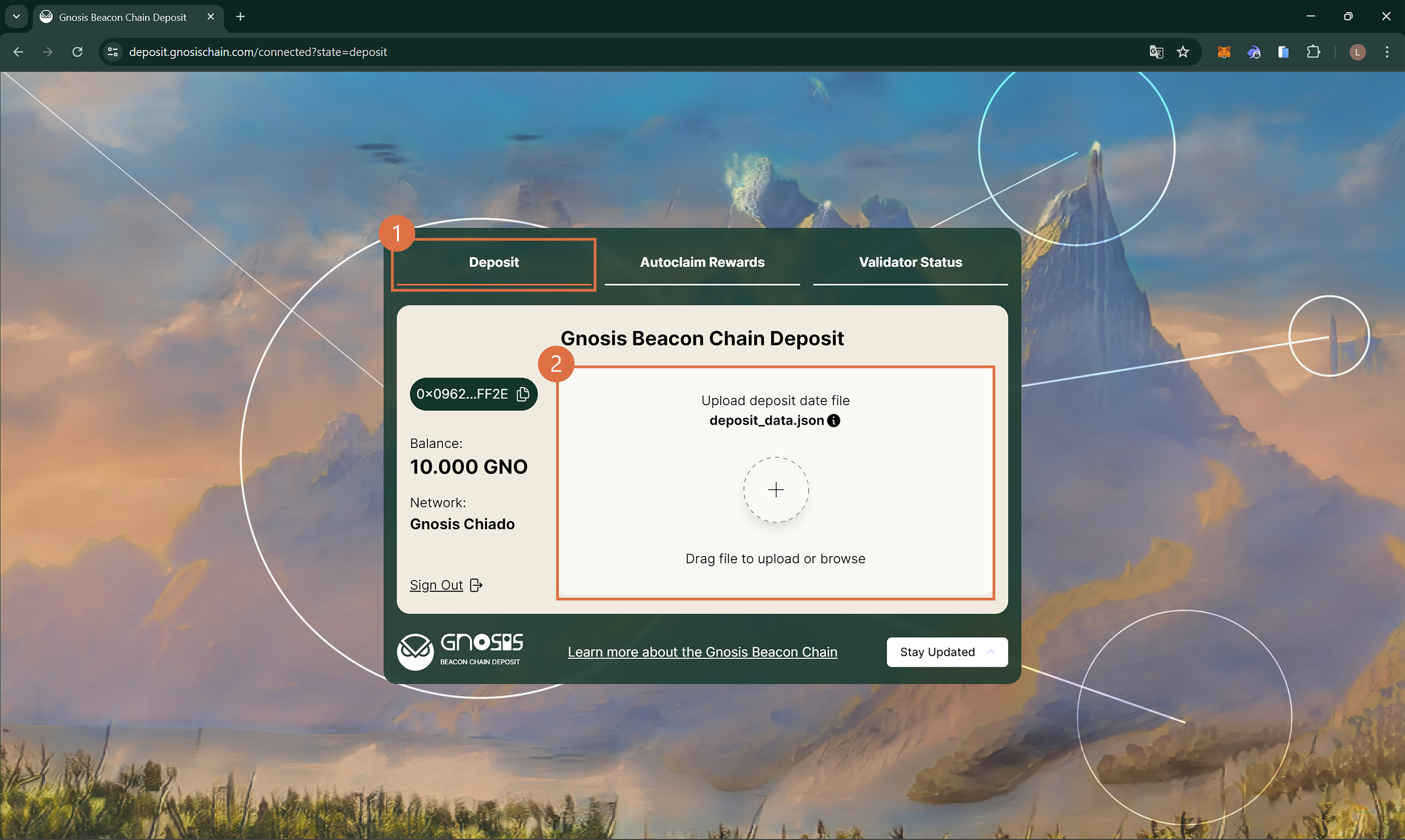 - Connect to Deposit UI https://deposit.gnosischain.com/ using Gnosis Chiado Testnet and follow the Option 1: Deposit UI.