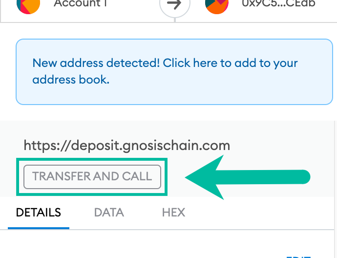 Check that the transaction's data includes the Deposit Contract address (0x0B98057eA310F4d31F2a452B414647007d1645d9)